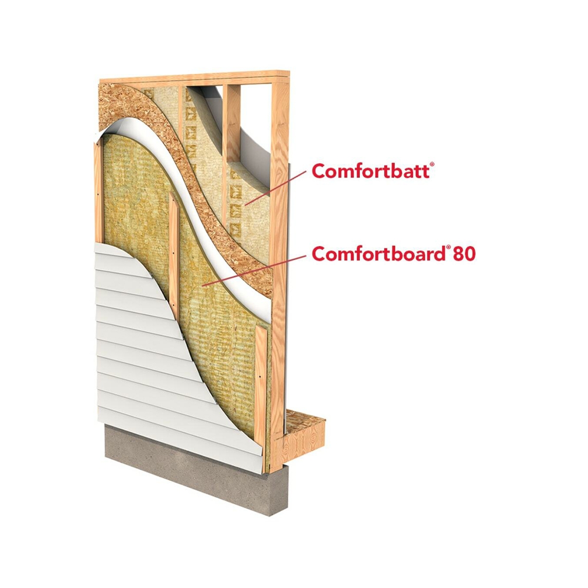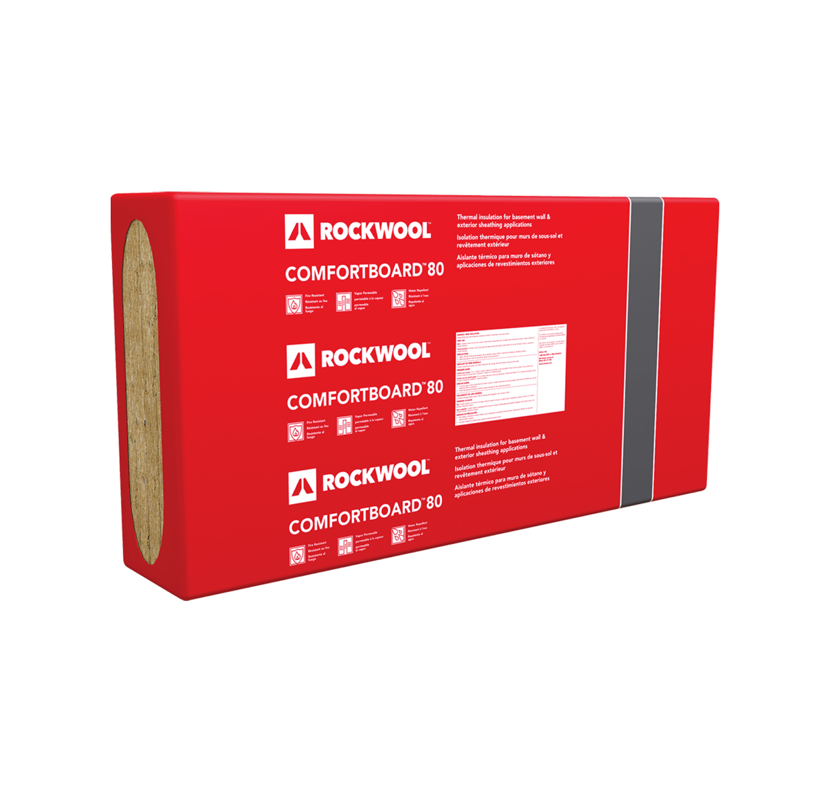 ROCKWOOL Comfortboard 80 rigid stone wool insulation is designed for exterior continuous insulation in residential and commercial construction, increasing the thermal performance of the building envelope.